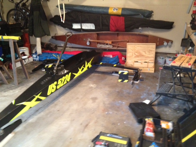 The snazzy black and green sled in the foreground is a brand-spankin’ new CSI hull and the wood boat behind it on the wall is the first DN I ever owned- She was built in 1962 by Walter “Wickie” McNeal in Edgewater, MD. Old meets new…. Had a blast sailing that thing- Thanks Wickie wherever you are!