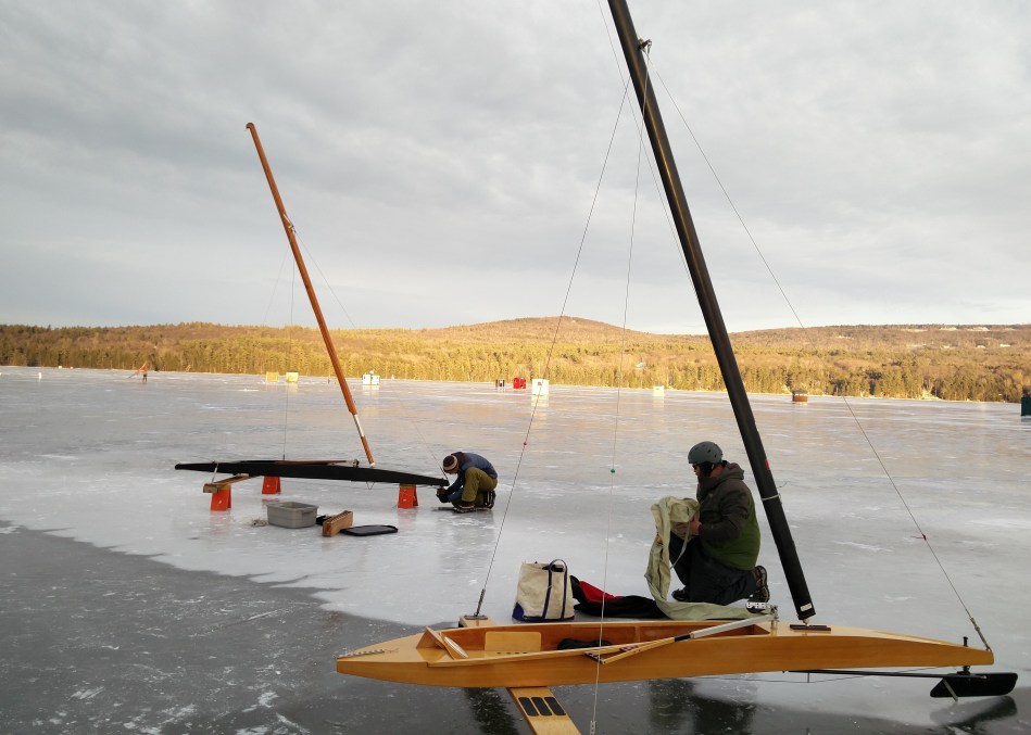 De-rigging under last light peaking over Mt Sunapee.