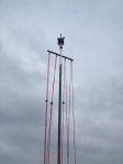 We used a new course format as well- the “safety zone” (aka “run out zone”) has been eliminated. The start line stays put and while one fleet is on the course the next fleet lines up. Once the last boat in one fleet finishes the next fleet goes off as soon as the scorers are ready, usually pretty quickly. This allows the RC to bang out races rapidly! Way less work for the RC and way less time wasted disconnecting and reconnecting the line. Also safer as there were frequently boats and innocent pedestrians in the safety/run-out zone. The finish line is now parallel to the breeze rather than perpendicular- you finish by leaving the leeward mark to port (checkered flag is near the 1/3 starting spot) and bleed off speed heading toward the right side of the course. Safer for the scorers and nice to be able to head up into the wind to slow down- couldn’t do that with the old safety zone as you had to sail straight downwind, only way to lose speed was by dragging your feet which doesn’t really slow you down but does ruin your spikes and is a great way to bang your Achilles tendon into the plank or even break your ankle. Just saying….