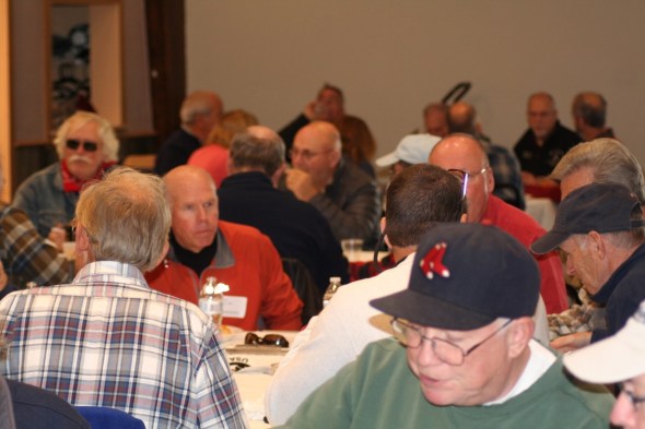 Lunch began shortly after the swap meet hoard were herded into the meeting room. We left the usual abstaining crowd in the lot. Maybe they had more fun out there but the real show featured chicken, Swedish meatballs, the usual sides and boat talk. But it was not as much about the food as the crowd of people all gathered together to talk mostly about iceboating past and future. Mixed well amongst the NEIYA veterans was six brand new members eager to join in.