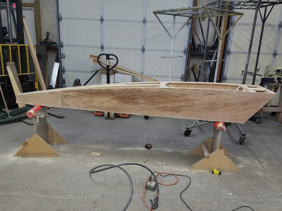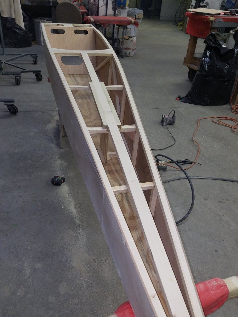 Brian modified the plan to lighten the overall weight of the hull. The lightening mods include 3/4 x 3/4 frames and truss work, 3/8th one pcs ply-wood floor, and 1/4″ side skins. He believes it should come in right around 60 pounds with foot steering assembly and springboard. The craft also features a nice 7″ trunk for safety gear, lunch etc. And open bulkheads with corner bracing. Given the light weight of both craft and pilot it ought to really scream down the ice.