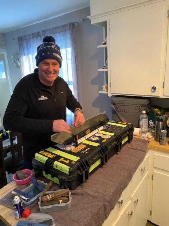 Ed Demerest’s boat getting a new plank in the living room. Where else?