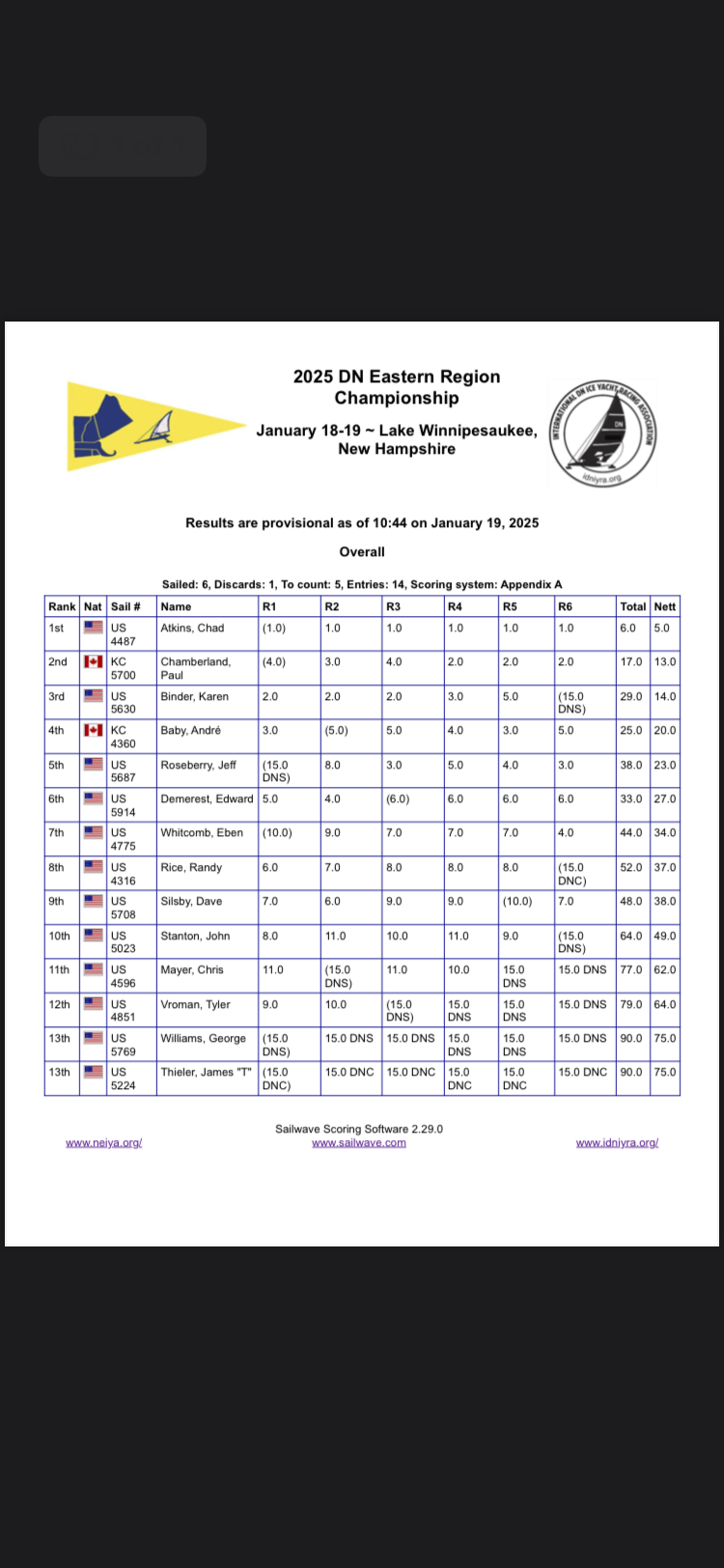 Karen Binder took third by one point after being cautious and sitting out the final race. Paul Chamberland squeaked ahead by one point to take second and Chad Atkins had the afterburners on and took first.
