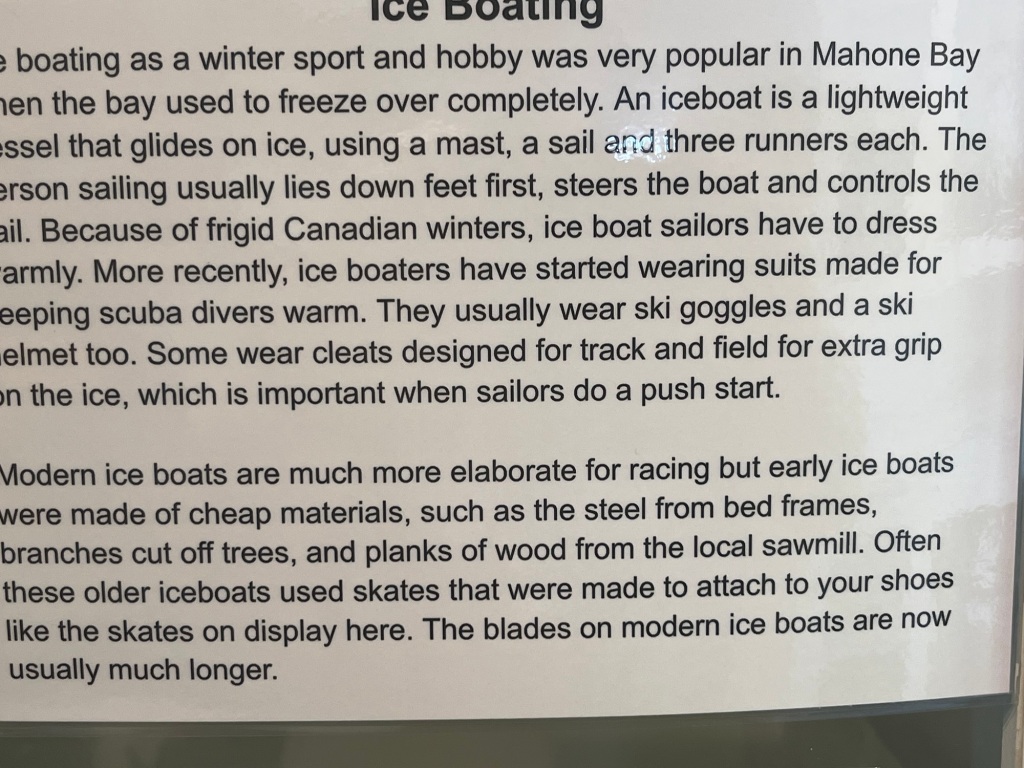 Mahone bay had just an older house of historical value and artifacts. I noticed two small models in a glass case and then caught the write up. It seems the bay would often freeze over and play time would occur. I was aware that the Maritimes did have ice sailors and often have seen their post.