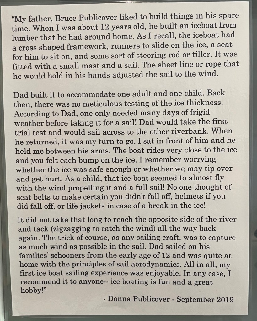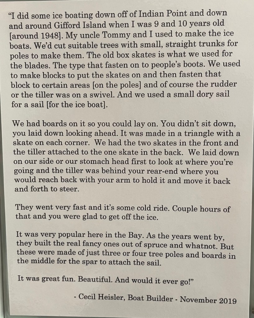 Any way, to get back to the title, I’d like to share a small display on Iceboating that I stumbled upon in a small museum in Mahone Bay , Nova Scotia. Our little camping excursion this year was the Cabot trail and following the coastline around the rest of Nova Scotia. Being a bit of a museum addict,( of certain genre) I caught several nice museums on this trip. Yes even the one on Rug Hooking in Cheticamp was nice. Yarmouth had a great one on the cod fishing industry and Lunenburg had a nice historical waterfront with a dory shop and a cooperage that is still making barrels with original machinery.