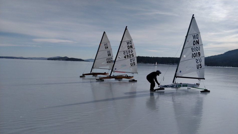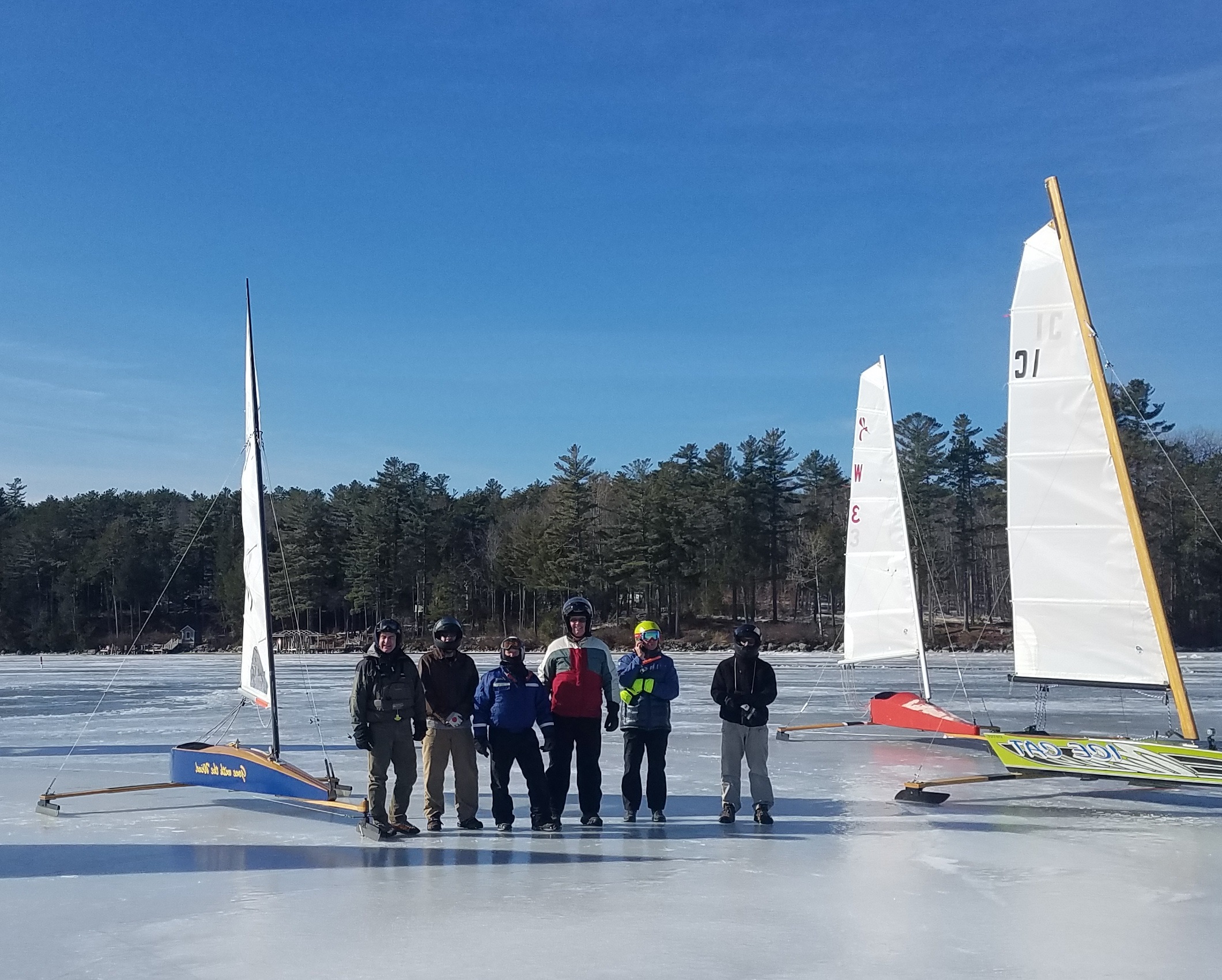 Sailors came from all over New England, Long Island NY, The Jersey Shore, and Andre’ Baby brought six Canadians down on his coattails two from far away Hamilton This almost invalidated thier participation in the Common Sense regatta but as we know ice draws us to the extreme. We were thrilled to host the MIT iceboating team with their four Buchholz build DNs. They were thrilled to take their first spin on an iceboat. Remember your first iceboat sail? Those smiles should remind you. We look forward to sailing with the MIT team again soon.