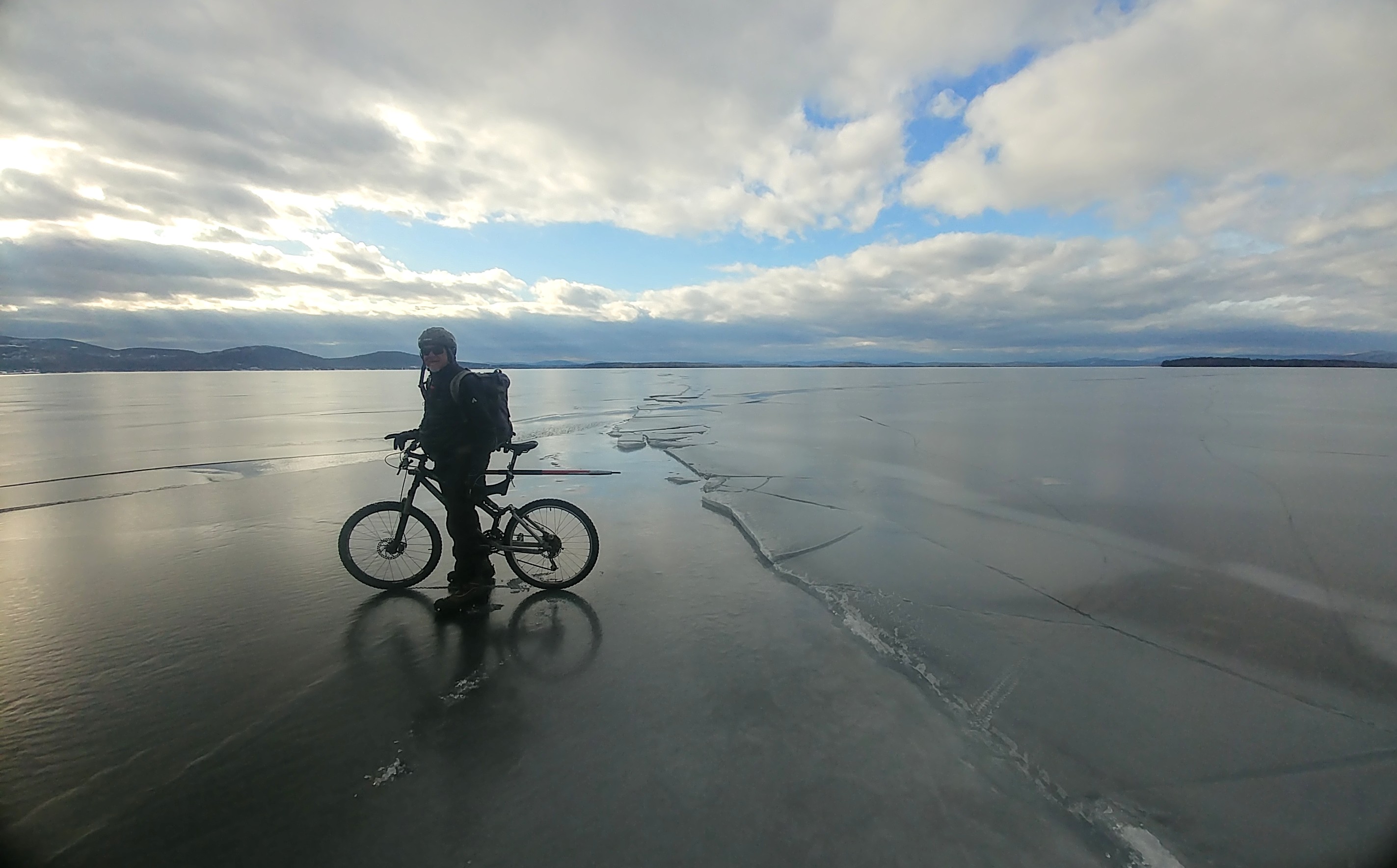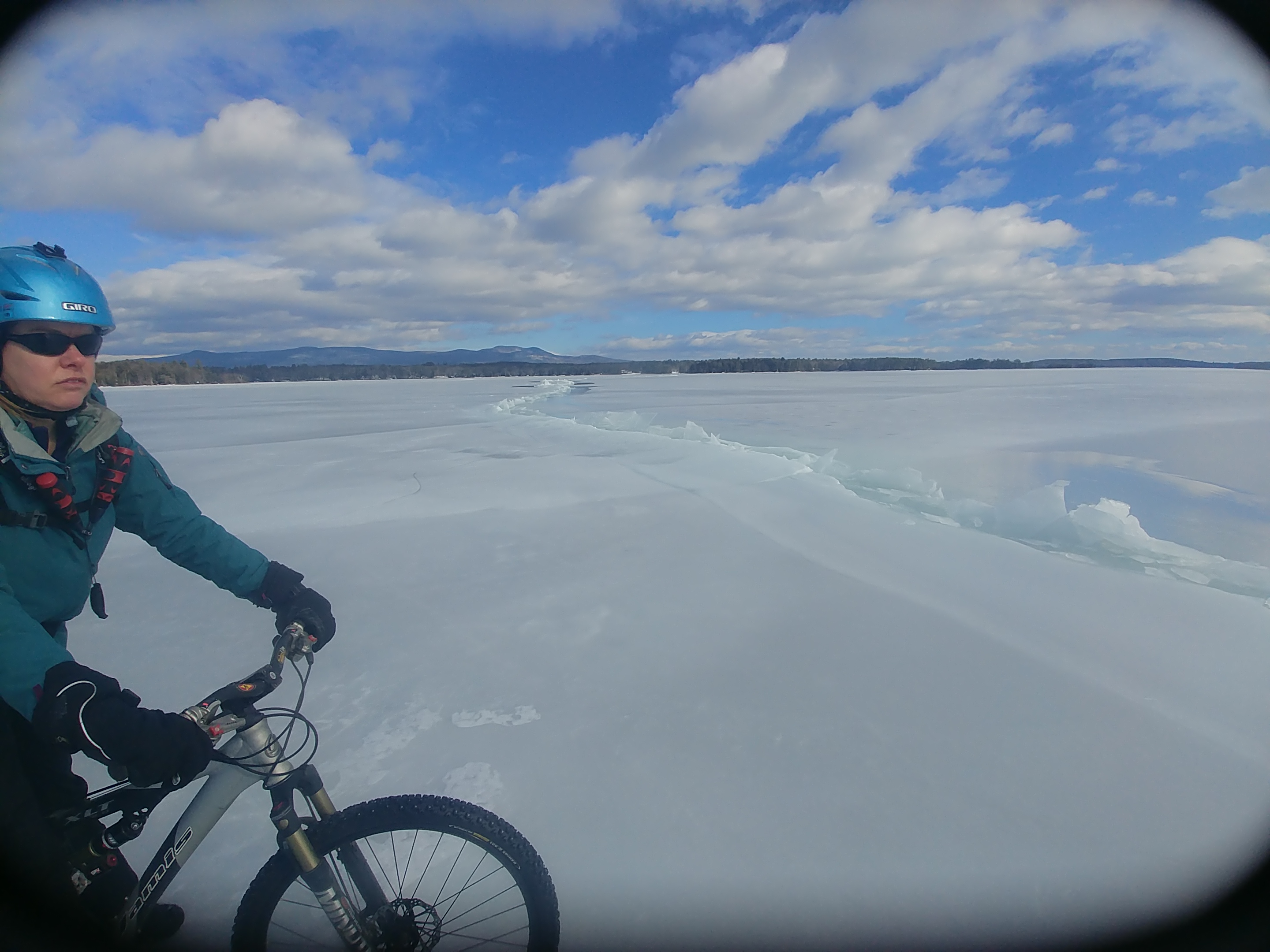 After a fairly epic bike ride the length of the lake today and consultation with several of the wise ones we’ve decided not to try a Hardway on Wednesday. The ice is fairly thin right now especially considering there is little if any open water and there are many hazards large and small. Every day the pressure ridges are different and new ones pop up. The ice from 3 Mile Isl. to Center Harbor is very very rough, and blocked by one of the biggest pressure ridges we encountered.