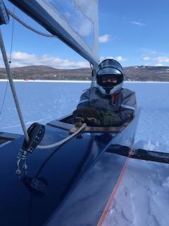Although completely snow covered on arrival this morning lake Sunapee showed herself in fine form today. Some uncommonly brave new sailors inhaled their first ice chips at speed and a light gaggle of cold blooded veterans got a handful of mother natures rowdiest winds coming down from the northwest. I overheard one sailor say they measured a gust of over 40mph and I heard others say they were ringing the bell at 40-50mph at speed…. and that is on 3/4” of hardening snow base! Crazy. I’ll forever recall the 80’ snow contrails blazing up from Kate Marones runners as she looked so calm at the tiller. An amazing day.