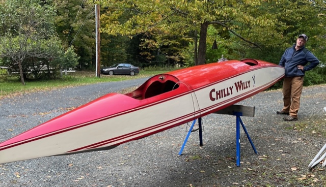 Meanwhile, feast your eyes on Randy Rice’s newest build (Randy is the Grand Master ice scout of mid-NH lakes). Don’t be fooled here, he was gearing up for a boat that looked vintage yet behaves like a modern build. His new boat “Zingo” boasts a 16’ carbon plank, 8’ front spring plank, 20’ tapered wing mast. Most of the build is redwood and is reported to be uber-light. Go, Randy! We look forward to seeing your new boat and you on the ice soon!