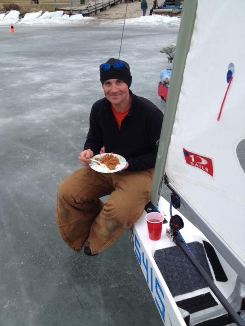 Temperatures were below freezing all weekend. On Saturday we sailed on 7 or 8 inches of hard salt-water ice covered with about 3 inches of soft snow. The wind started at about 8 knots and built to 10 to 12 as the day progressed. Plate runners and FO1s were the order of the day. As the day wore on the snow began to drift and the ride got bumpier as the boats knocked to tops off the drifts. It was fast, powered-up sailing, and Bob Crinion had the measure of us with six bullets.