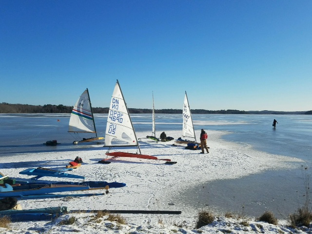 There has been iceboating in both the Midwest and Maine last weekend. I went out to the Great Western Challenge on business/pleasure trip but unfortunately the weather did not want to cooperate. We had a lake with beautiful ice but no wind on Saturday, and with a pending snowstorm coming, we threw in the towel on Saturday. We did sail for a while on Friday in smaller numbers and it was great to get back in the boat! The sailors from the east met on Plymouth Pond last Sunday in Maine to kick off the season as well.