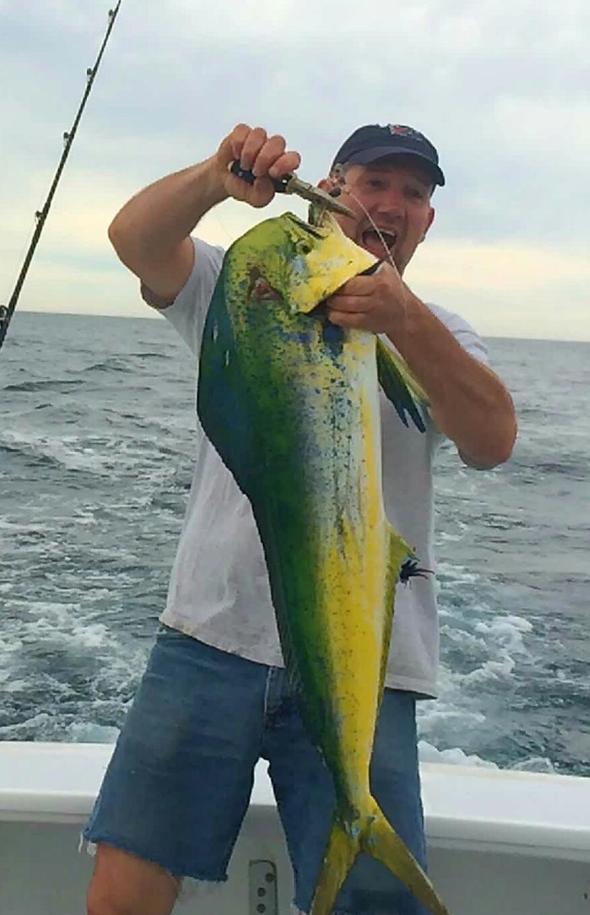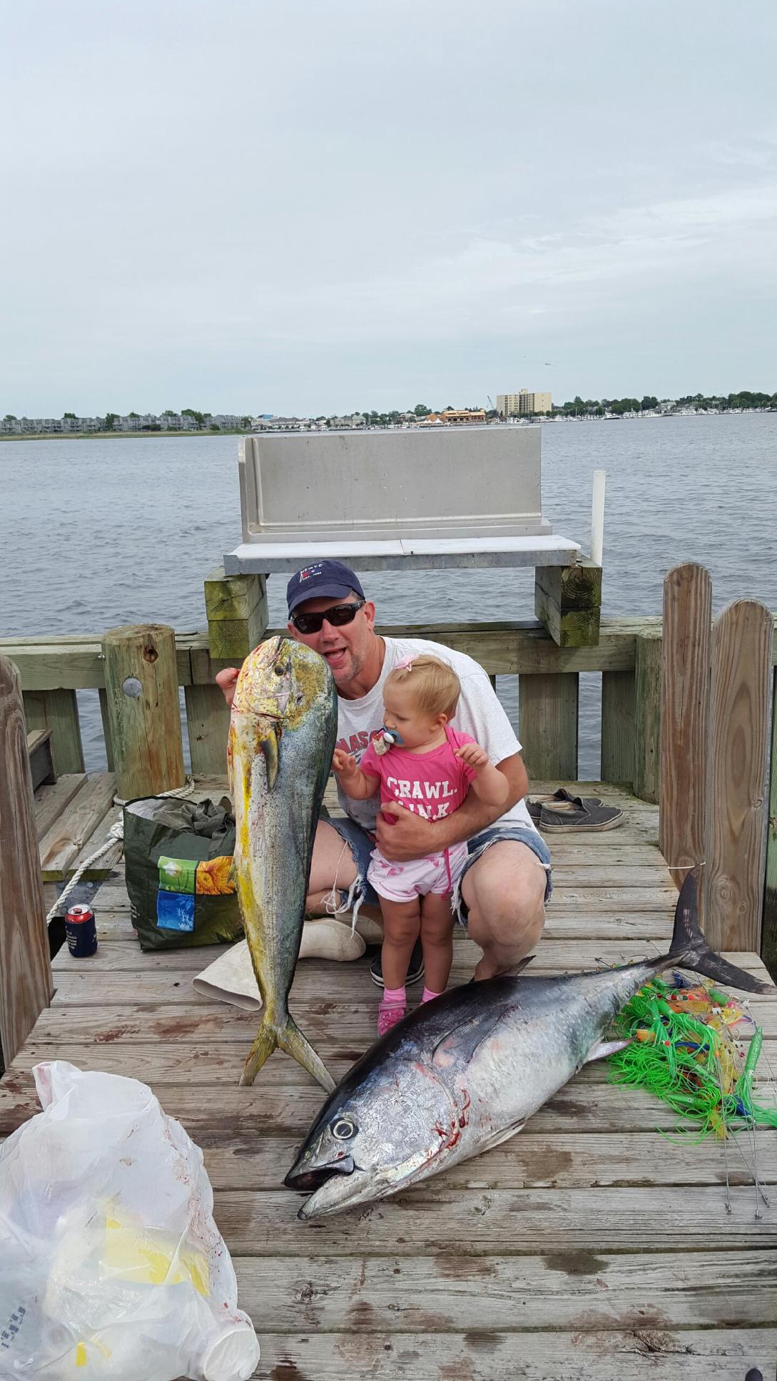 Rumor has it that his daughter reeled in the tuna because he was tired out after reeling in the dolphin….