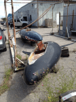 Saw these keel bulbs and fins at the big boatyard in Portsmouth, RI the other day…. The one with the shark’s teeth was on AMERICA3 (“cubed”) and the black one was under the Italian challenger, Il Moro De Venezia.