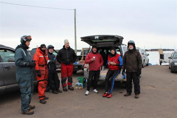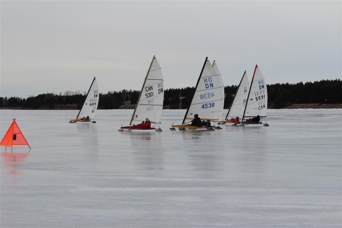 Six DNs travelled from Nova Scotia to PEI this weekend to join PEI-based NIYC members on Covehead Bay, near Stanhope. Some were cruisers but there were enough racers for us to decide to sail for the Nova Ice Yacht Club’s Nova Scotia trophy – OK , we were in PEI, but have you seen any ice in NS recently? There was about 2 km of available ice with plenty of room to set a course about 0.6 mile in length.