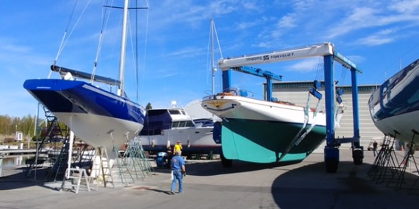 Eben Whitcomb, DN sailor and all around boat guy, sends this shot of two boats getting launched at Pilots Point Marina.