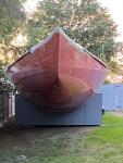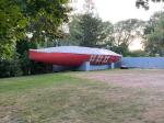 On your way to Crosby’s Yacht Yard (72 Crosby Cir, Osterville, MA 02655) you’ll see a big red boat in someone’s back yard. It will look familiar and yet out of place, odd to see a boat that size in a back yard.