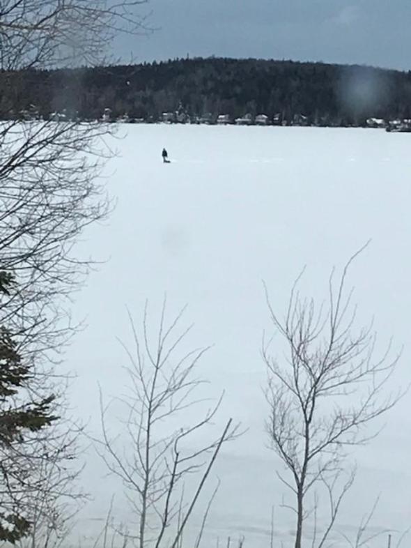 DN sailor Marc Tarini photographed checking ice a few minutes ago, in the middle of Lac du Huit near Thetford Mines. He mentions there is still 15 inches black ice underneath 4 inches new snow.