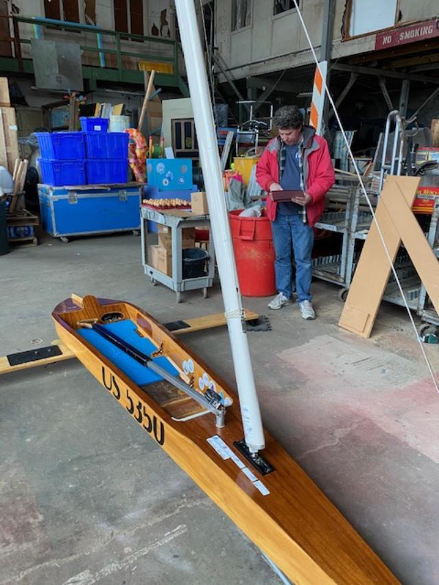 “Here we see Vice Commodore Pete checking his rigging and making some adjustments before putting boat away. If you are doing any summer Iceboat projects, take a picture and send it out. If any needs help, advice, parts or just want to talk Iceboating, please let me know