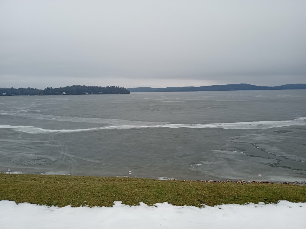 There is a sailable chunk of ice out of Leavitt’s beach in Meredith, NH. There is a rough area at the launch where slush trudgers marched through but smooths out nicely within 100 meters. There is a weak line about 30 meters out that has surprised 2 people already. Hug the shore and go left gets you by it. There looks to be about 3-4” black with 2-3 grey on top. Most has a nice orange peel surface with it getting bumpier beyond 3 mile island. There are some healed over holes to be alert to some marked but many not. There is thin ice that would eat a runner and some a boat. They are a darker grey and may have a snow hummock. Beyond 3 mile it gets tricky with the holes, leads and some pressure spots building. The area is not without its hazards so scout carefully and thoroughly at slow speed before heavy play. There are 3 boats there now waiting patiently for wind. Sorry I don’t have a current pic.