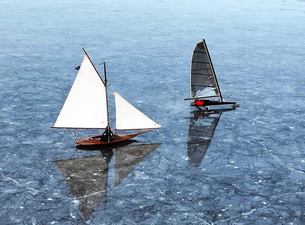 So there was a lot to keep track of during the races- speed, shifts, controlling the boat, all the while looking for lanes through the drifts. They weren’t always obvious but you could usually find a path that wasn’t as bad as the surrounding area. If you could find a clear lane wide enough for all three runners life was good for a few seconds. More often you’d have to let the windward runner go through the drift. Even worse you’d have to let the front and windward runner hit one. Worst case was having to go through one with all three and when this happened it was important to slide aft a bit and ease the sheet an inch to keep the boat on it’s feet and keep the flow attached to the leeward side of the sail as the boat slowed and the apparent wind went aft. As I said, there was a lot to keep track of! If you were able to get in the zone it was a great feeling…. Looking for clear areas to tack and gybe in was a priority as well. In those conditions I think it helps to keep your head up and look for the clear lanes rather than tuck in for less wind resistance. I figure snow drifts are thicker than air so it’s worth it to keep an eye on them!
