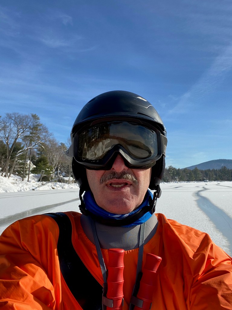 More recently when I started Nordic skating and purchased a DN, I bought a pair of more upscale “ice-claws” that hang around my neck on a plastic holder. Last season after a “wake- up call” on Newfound Lake (sailing towards open water at 30 knots) I bought a dry suit and started wearing it out on the ice.