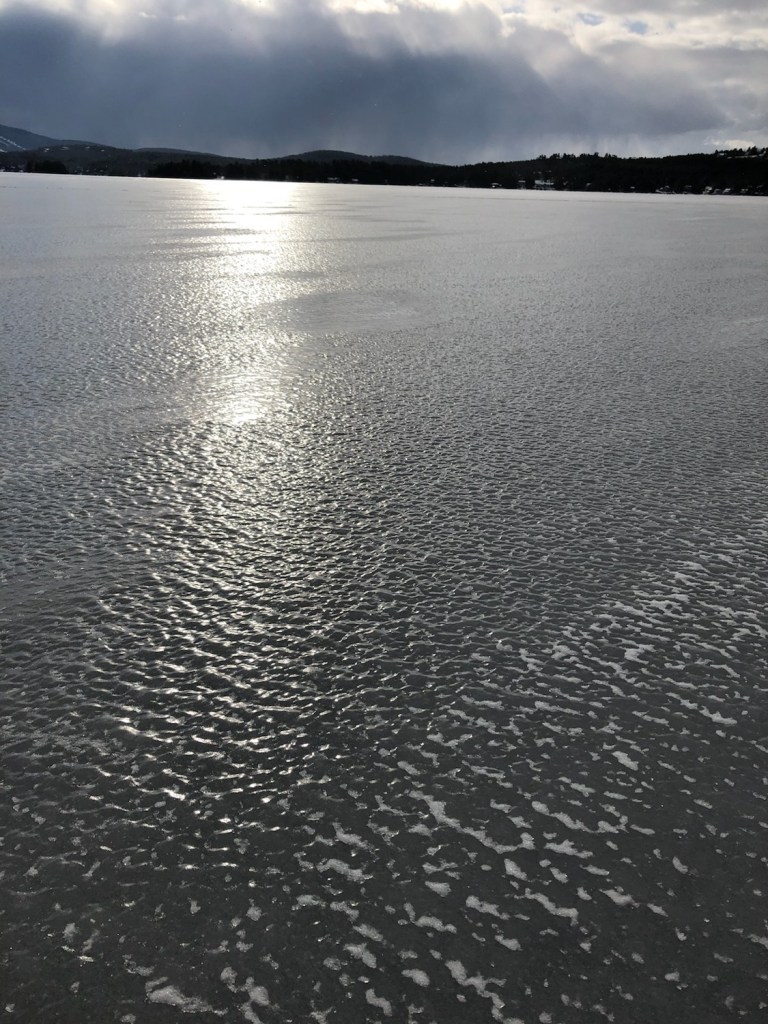 The plate looks great. There is a thin film of water skimmed with ice. You’ll probably bump over our footprints tomorrow. It is four inches everywhere; very little variation. Ice is hard and will give us a 7ish surface. There is one open crack crossing the lake, and we found two drainholes that could eat a runner, but just barely. There might be others.