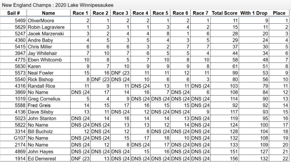 It was very fun last weekend and I am so glad we were able to get in a regatta with so many boats on the line. I did my best to interpret the score sheets I was handed…if a mistake please let me know and I will do my best to review/correct. My email is karenbinder@hotmail.com